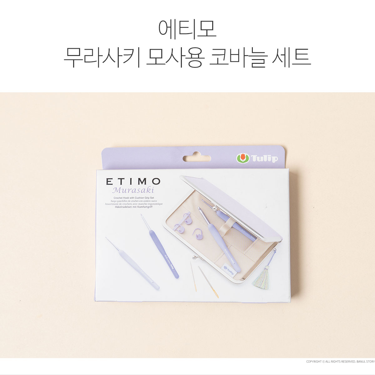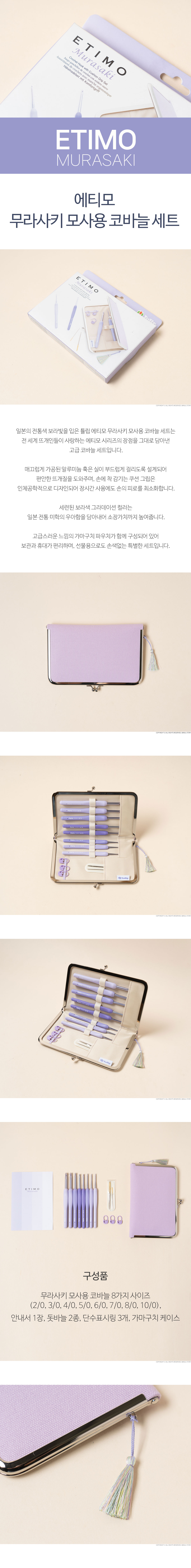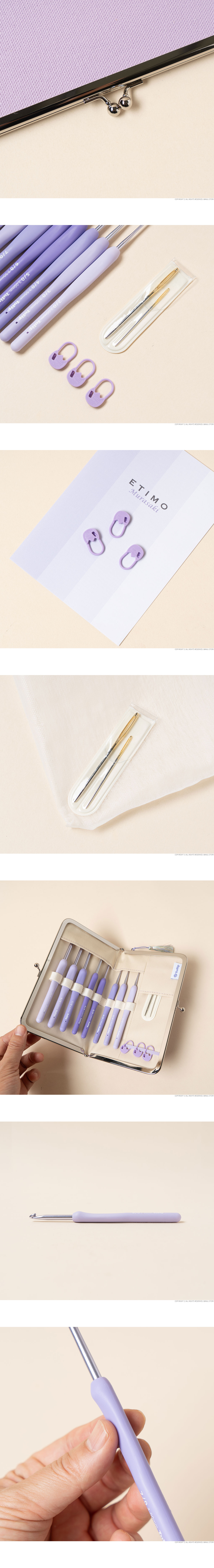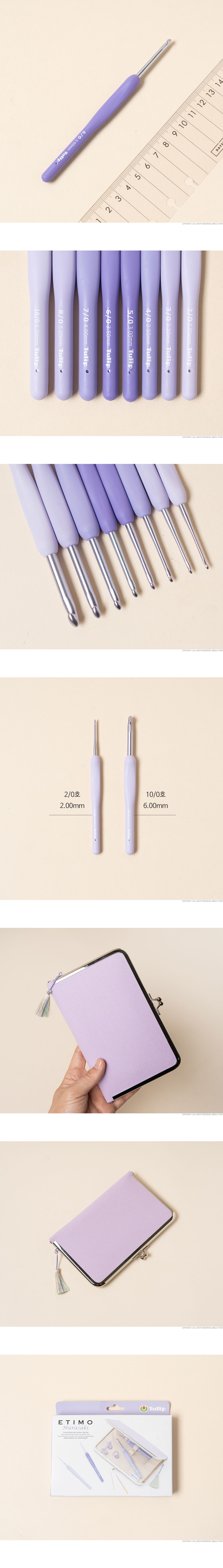 + 바늘재질: 바늘 - Aluminum / 손잡이 - Elastomer + 일본의 전통색 보라빛을 입은 튤립 에티모 무라사키 모사용 코바늘 세트는 전 세계 뜨개인들이 사랑하는 에티모 시리즈의 장점을 그대로 담아낸 고급 코바늘 세트입니다. + 매끄럽게 가공된 알루미늄 훅은 실이 부드럽게 걸리도록 설계되어 편안한 뜨개질을 도와주며, 손에 착 감기는 쿠션 그립은 인체공학적으로 디자인되어 장시간 사용에도 손의 피로를 최소화합니다. + 세련된 보라색 그라데이션 컬러는 일본 전통 미학의 우아함을 담아내어 소장가치까지 높여줍니다. + 고급스러운 느낌의 가마구치 파우치가 함께 구성되어 있어 보관과 휴대가 편리하며, 선물용으로도 손색없는 특별한 세트입니다. + 알루미늄 소재 특성상 사용에 따라 미세한 스크래치가 발생 할 수 있으며 이는 불량이 아닙니다.