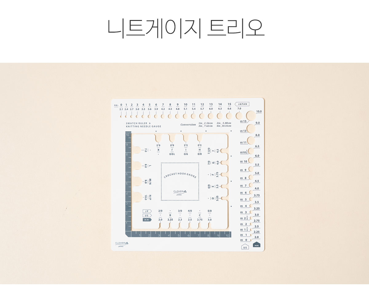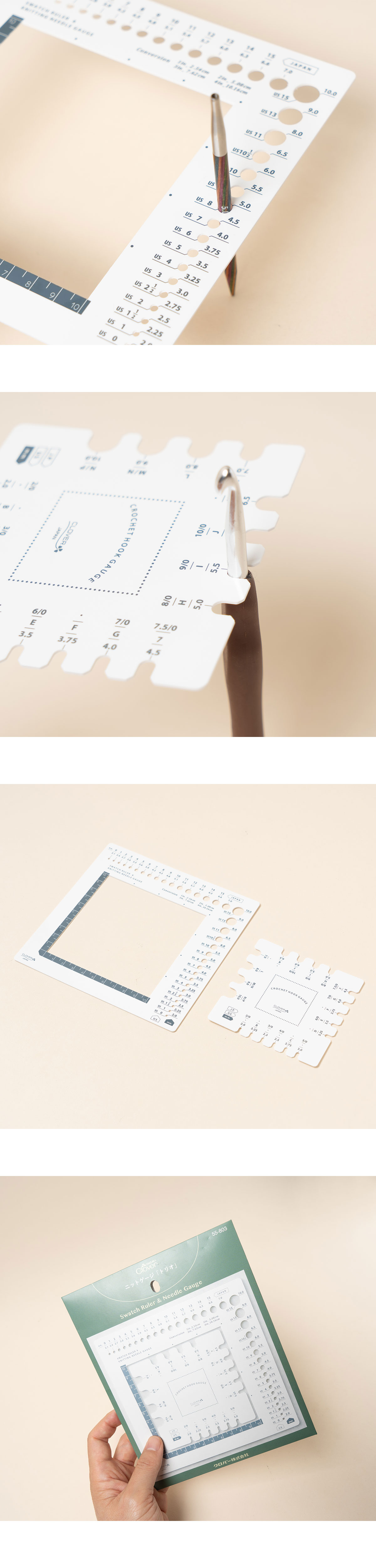 + 제품구성: 대바늘&스와치 게이지 1개, 코바늘 게이지 1개 + 색상: 화이트 + 사이즈: 대바늘&스와치게이지 15.5 x 15.5cm / 코바늘게이지 9.6 x 9.6cm + 뜨개질과 코바늘 작업을 한층 더 정확하고 손쉽게 만들어주는 Clover Swatch Ruler & Needle Gauge입니다. + PET 소재로 가벼우면서도 내구성이 좋아 오랜 시간 사용하기 적합합니다. + 바늘 게이지: 바늘 끝을 구멍에 넣어 미국식, 미터법, 일본식 표준 사이즈를 확인할 수 있습니다. + 코바늘 게이지: 코바늘 샤프트를 홈에 넣어 사이즈를 측정합니다. + 스와치 게이지: 10cm(4인치) 크기의 창을 통해 샘플의 코와 단을 동시에 셀 수 있어 정확한 게이지 측정이 가능합니다. + 이 도구 하나로 바늘과 코바늘 사이즈 확인부터 샘플 게이지 측정까지 손쉽게 할 수 있어, 다양한 패턴을 정확하게 완성하는 데 큰 도움이 됩니다. ![]()
