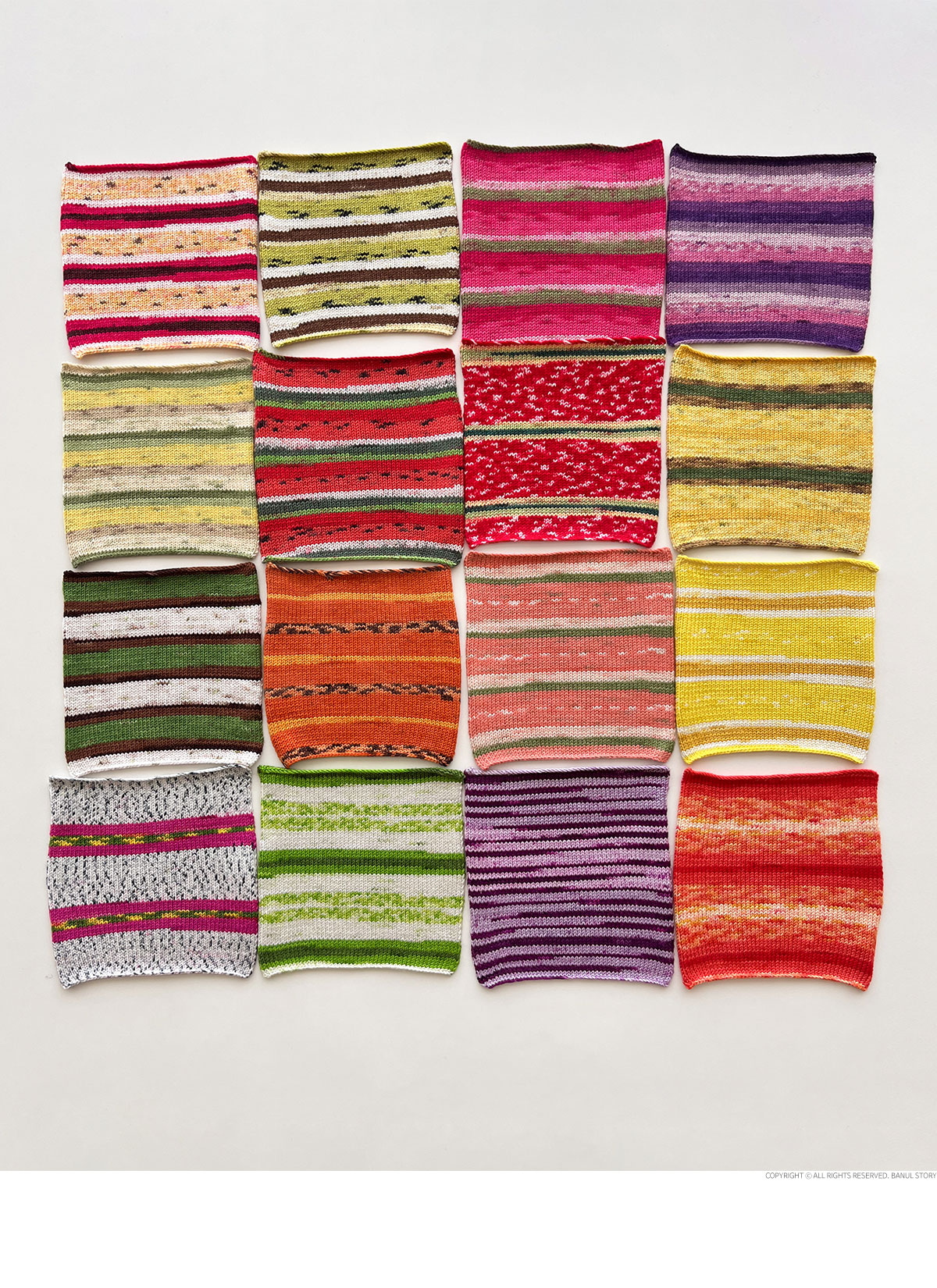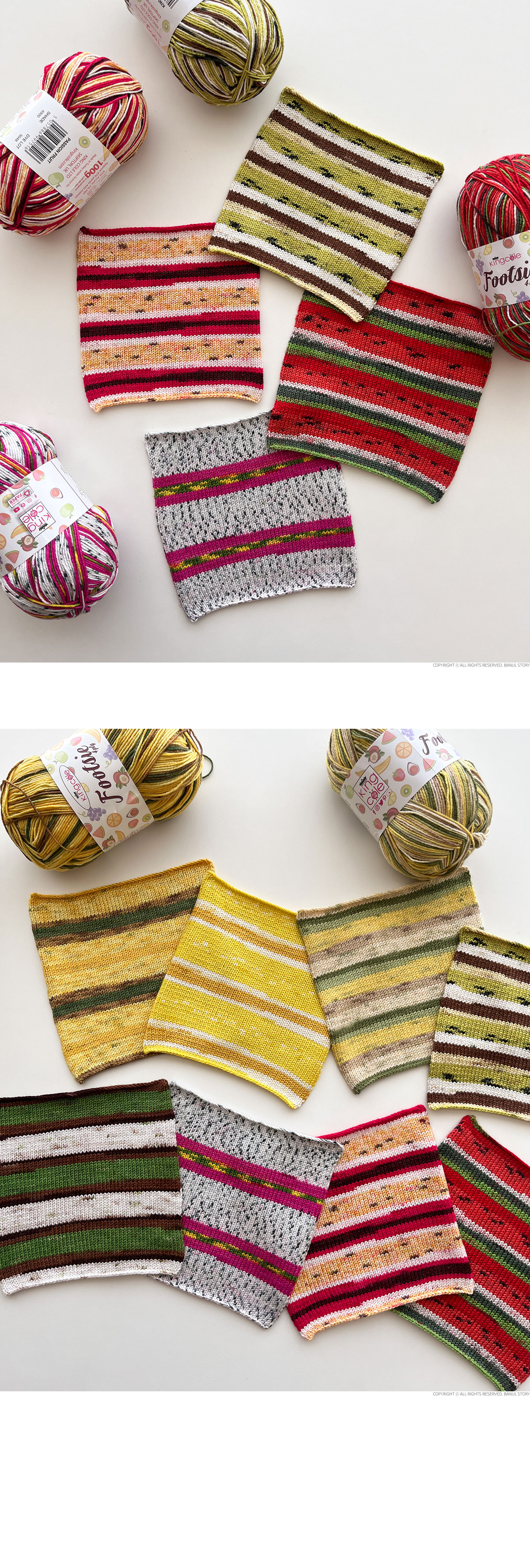 + Footsie는 과일을 연상케 하는 다채로운 색감이 실 전체를 자연스럽게 흘러가듯 표현하는 배색 실입니다. + 색 하나하나가 과일들에서 영감을 받아, 실을 뜰 때마다 마치 과일 조각이 이어지는 듯한 매력을 전합니다. + 울을 사용하지 않아 울 알레르기가 있는 분들도 안심하고 사용할 수 있고, 양말이나 손끝 가까이 피부와 닿는 소품에 쓰기에도 적합합니다. + 단조로운 무늬에도 화사한 포인트를 주고 싶을 때, Footsie는 작품의 생기를 불어넣는 매력적인 선택이 될 것입니다. + 실이 얇고 매끈해 잘 엉키는 타입입니다. 실이 안쪽까지 꽉 감겨있기 때문에 안쪽에서부터 실을 풀어서 사용하시면 엉키거나 매듭이 잘 생길 수 있어 겉에서부터 사용하시는 것을 권장 드립니다. ![]()