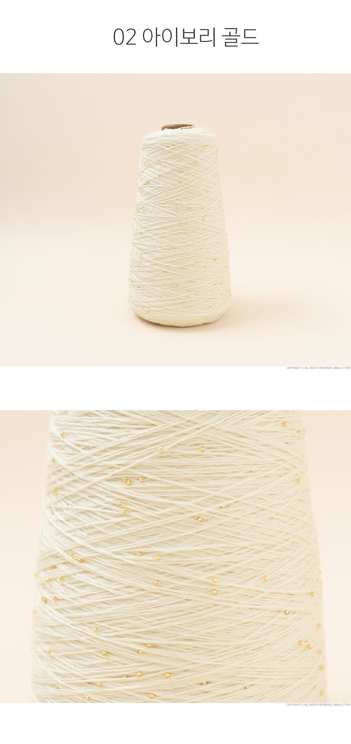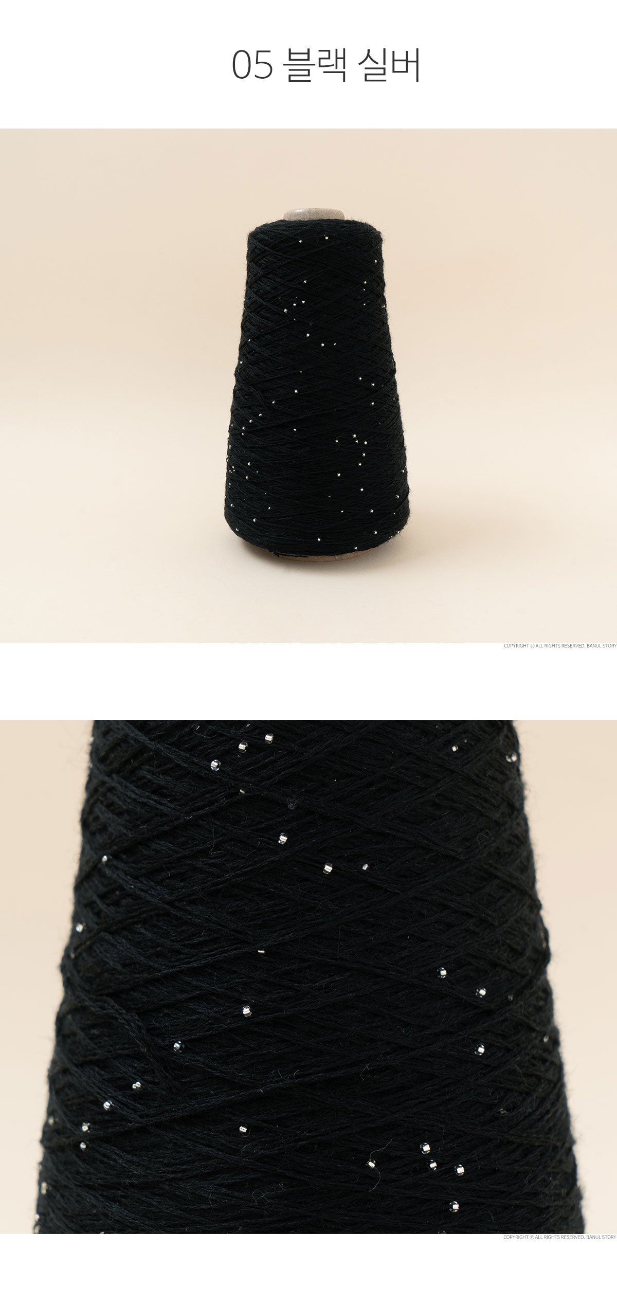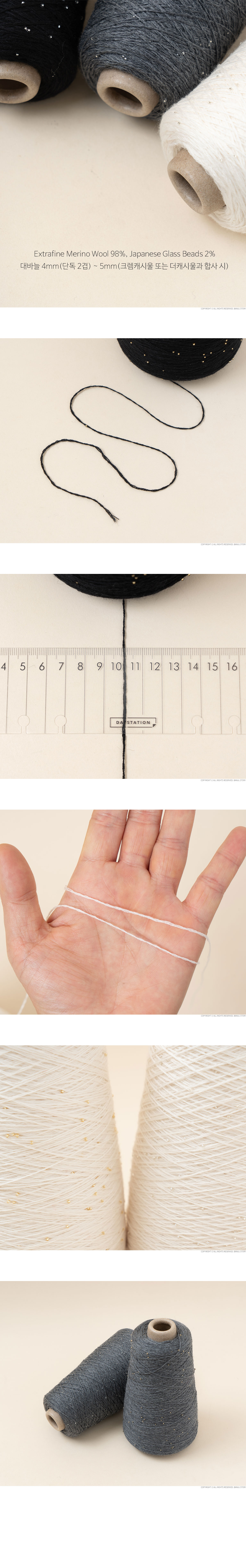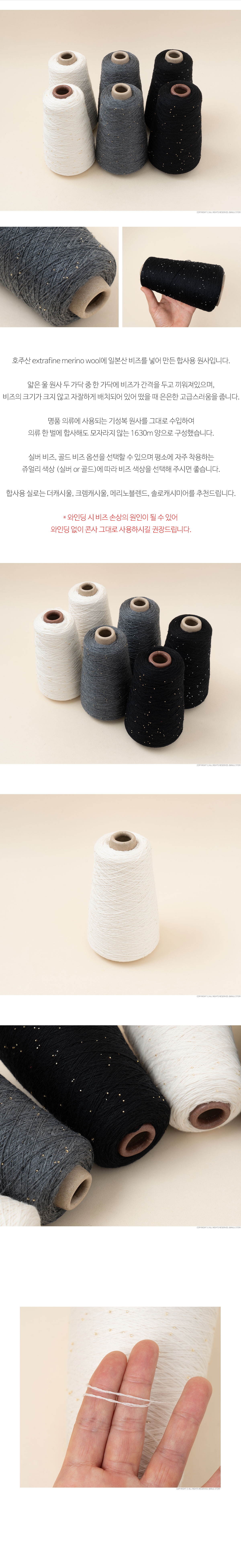 + 호주산 extrafine merino wool에 일본산 비즈를 넣어 만든 합사용 원사입니다. + 얇은 울 원사 두 가닥 중 한 가닥에 비즈가 간격을 두고 끼워져있으며, 비즈의 크기가 크지 않고 자잘하게 배치되어 있어 떴을 때 은은한 고급스러움을 줍니다. + 명품 의류에 사용되는 기성복 원사를 그대로 수입하여 의류 한 벌에 합사해도 모자라지 않는 1630m 양으로 구성했습니다. + 실버 비즈, 골드 비즈 옵션을 선택할 수 있으며 평소에 자주 착용하는 쥬얼리 색상 (실버 or 골드)에 따라 비즈 색상을 선택해 주시면 좋습니다. + 합사용 실로는 더캐시울, 크렘캐시울, 메리노블렌드, 솔로캐시미어를 추천드립니다. + 와인딩 시 비즈 손상의 원인이 될 수 있어 와인딩 없이 콘사 그대로 사용하시길 권장드립니다.