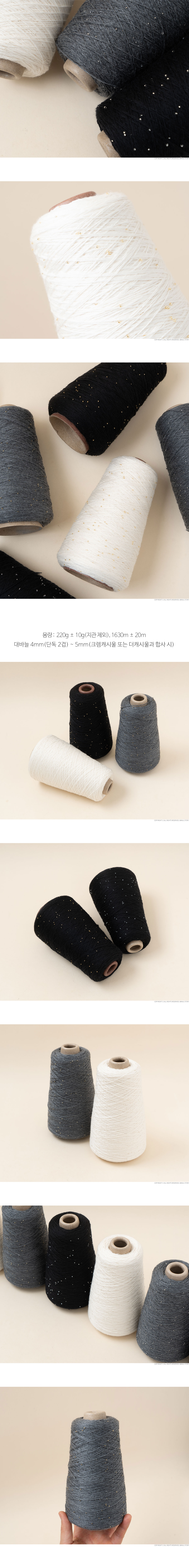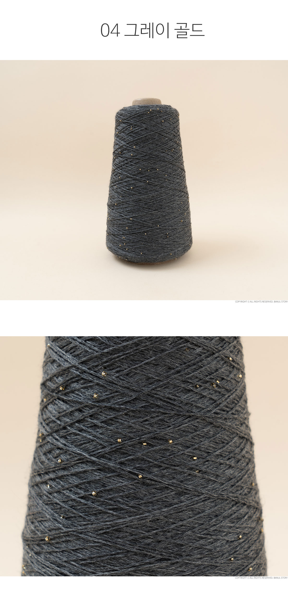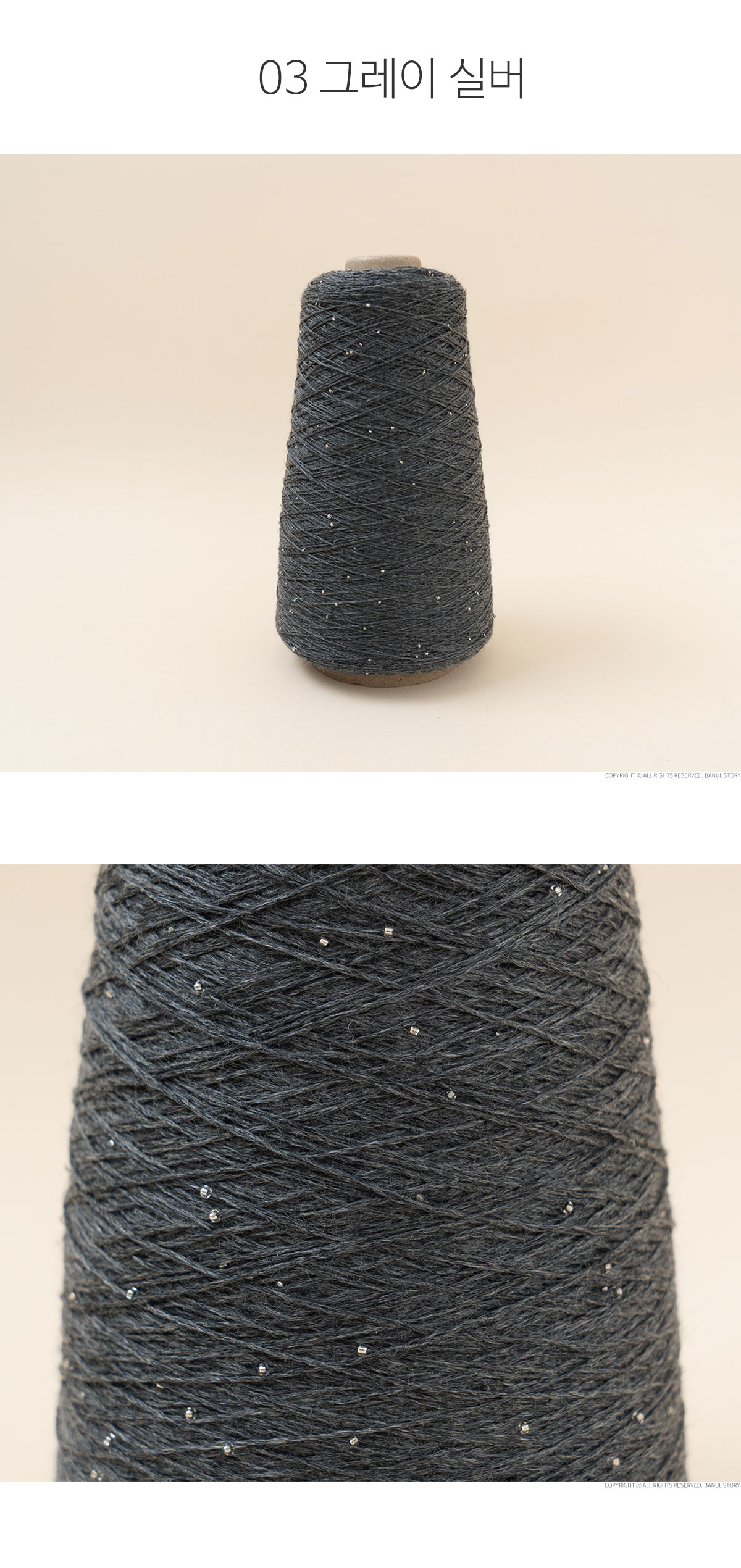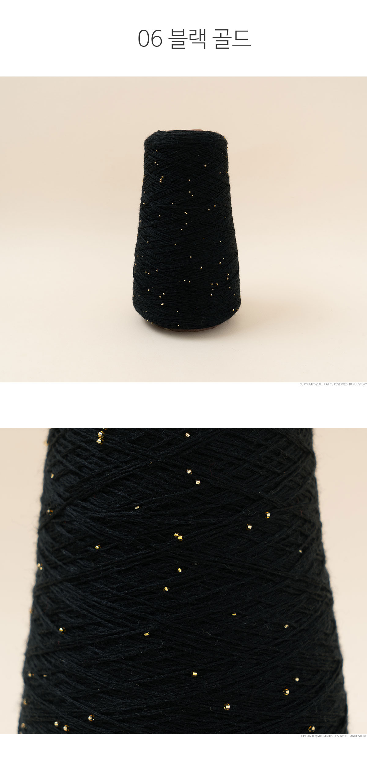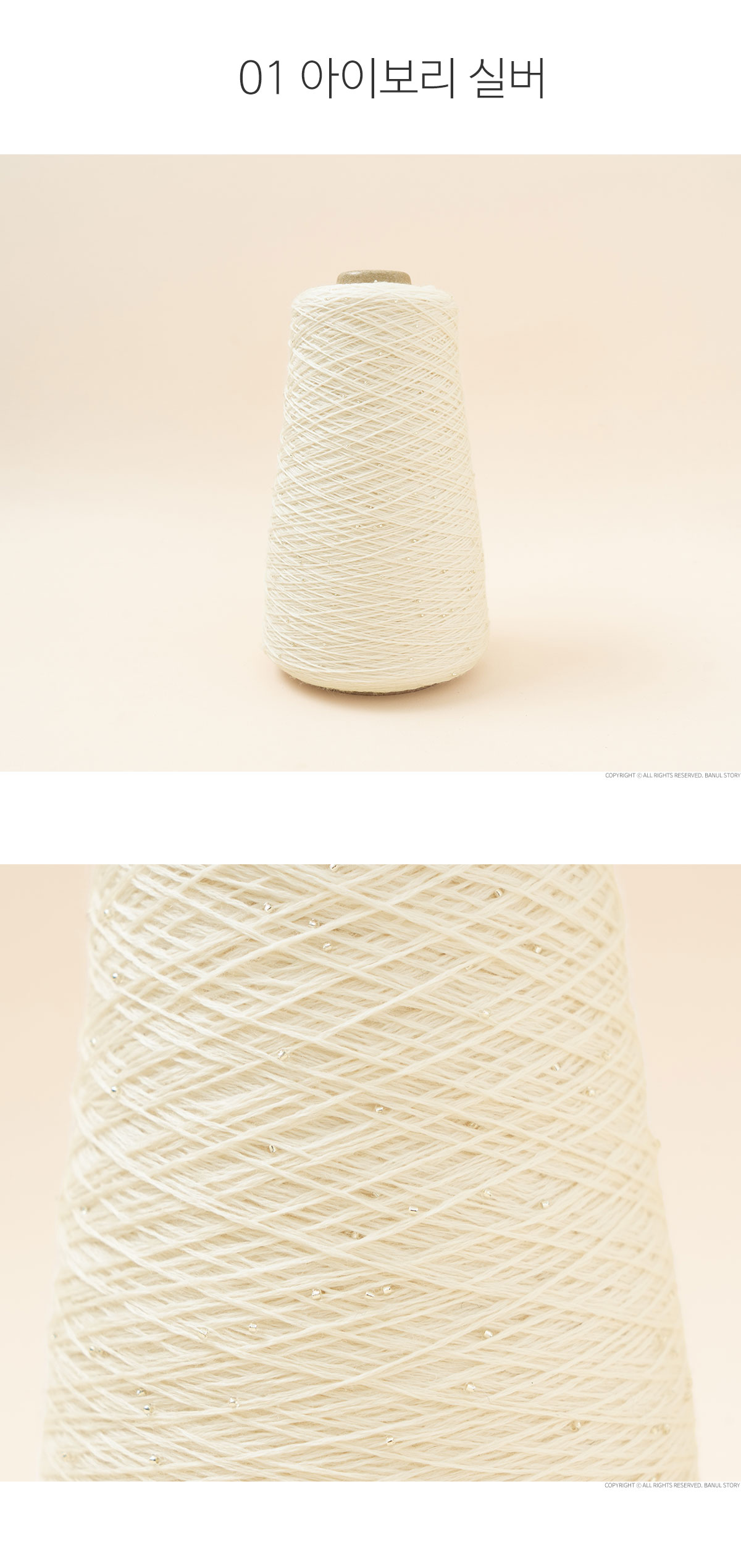 + 호주산 extrafine merino wool에 일본산 비즈를 넣어 만든 합사용 원사입니다. + 얇은 울 원사 두 가닥 중 한 가닥에 비즈가 간격을 두고 끼워져있으며, 비즈의 크기가 크지 않고 자잘하게 배치되어 있어 떴을 때 은은한 고급스러움을 줍니다. + 명품 의류에 사용되는 기성복 원사를 그대로 수입하여 의류 한 벌에 합사해도 모자라지 않는 1630m 양으로 구성했습니다. + 실버 비즈, 골드 비즈 옵션을 선택할 수 있으며 평소에 자주 착용하는 쥬얼리 색상 (실버 or 골드)에 따라 비즈 색상을 선택해 주시면 좋습니다. + 합사용 실로는 더캐시울, 크렘캐시울, 메리노블렌드, 솔로캐시미어를 추천드립니다. + 와인딩 시 비즈 손상의 원인이 될 수 있어 와인딩 없이 콘사 그대로 사용하시길 권장드립니다.