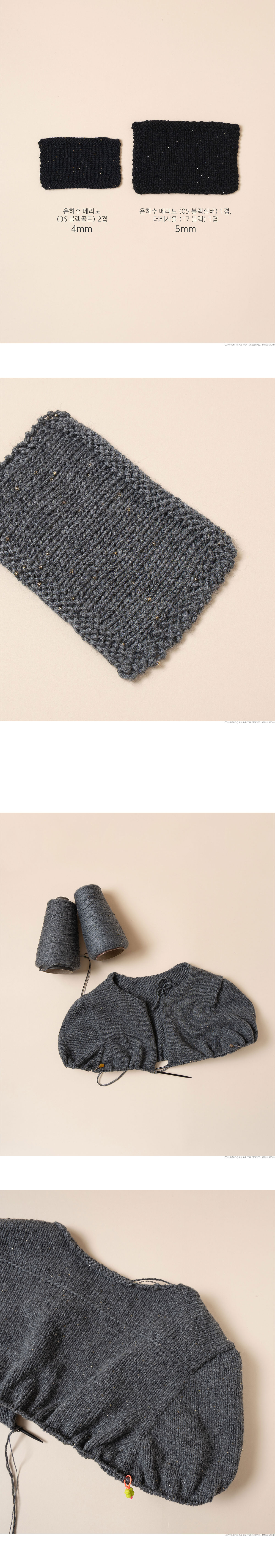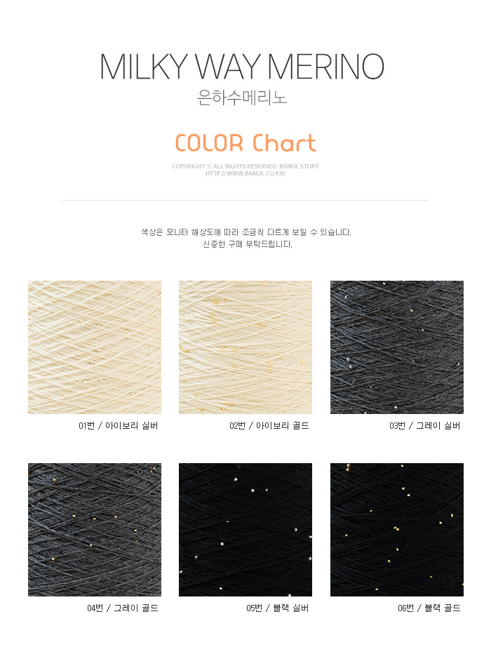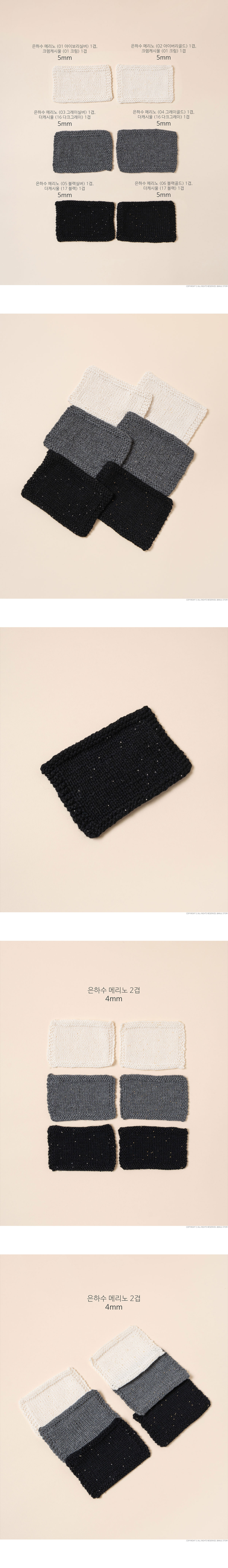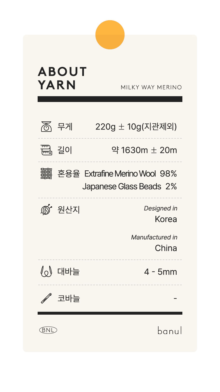 + 사용바늘: 은하수 메리노 단독 2겹 대바늘 4mm / 크렘캐시울 또는 더 캐시울과 합사 시 5mm + 혼용율: Extrafine merino wool 98%, Japanese glass beads 2% + 게이지: 23코 34단 (대바늘 4mm, 10cm x 10cm, 메리야스 편물, 은하수 메리노 2겹) / 18코 26단 (대바늘 5mm, 10cm x 10cm, 메리야스 편물, 더캐시울 1겹 + 은하수 메리노 1겹) / 18코 24단 (대바늘 5mm, 10cm x 10cm, 메리야스 편물, 크렘캐시울 1겹 + 은하수 메리노 1겹) + 제조사: 한국 + 원산지: 중국
