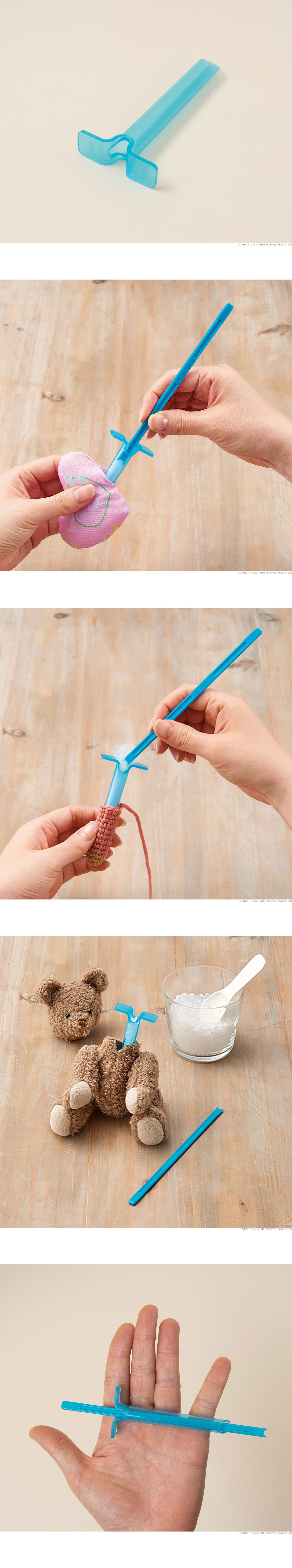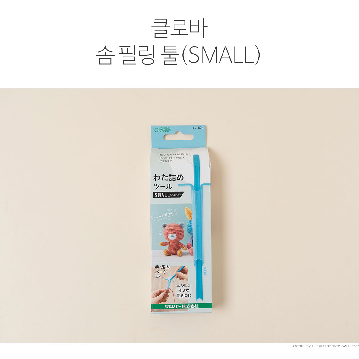 + 원산지: 일본 Clover사 + 구성: 본체 1개 + 막대 1개 + 사이즈: small + 소재: 폴리프로필렌, ABS 수지 + 색상: 블루 + 크로바(Clover)의 솜 필링 툴은 인형, 아미구루미, 소품 제작 시 솜을 쉽고 깔끔하게 채울 수 있도록 도와주는 전용 도구입니다. + 끝이 매끄럽게 처리된 스틱 형태로, 좁은 부분이나 모서리까지 솜을 고르게 밀어 넣을 수 있어 형태를 예쁘게 잡아줍니다. + 힘 조절이 쉬워 솜이 뭉치거나 원단이 손상될 걱정 없이 섬세한 작업이 가능하며, 초보자부터 숙련자까지 모두 사용하기 좋습니다. + 가볍고 손에 잘 잡히는 디자인으로 장시간 작업에도 부담이 적어, 인형·쿠션·소형 소품 제작에 필수적인 아이템입니다.