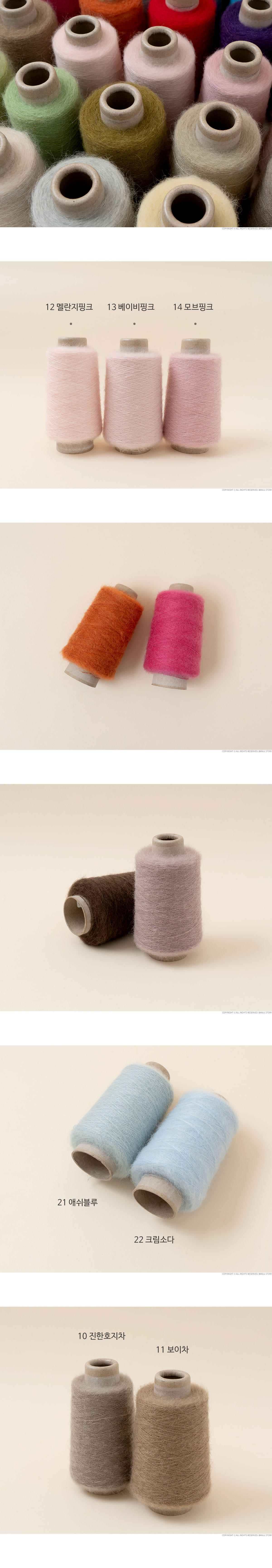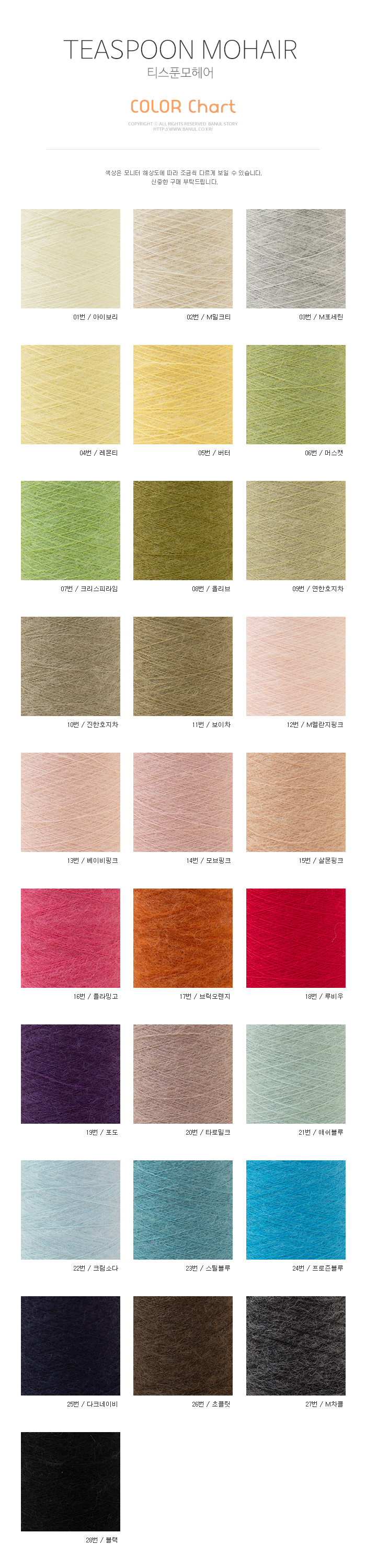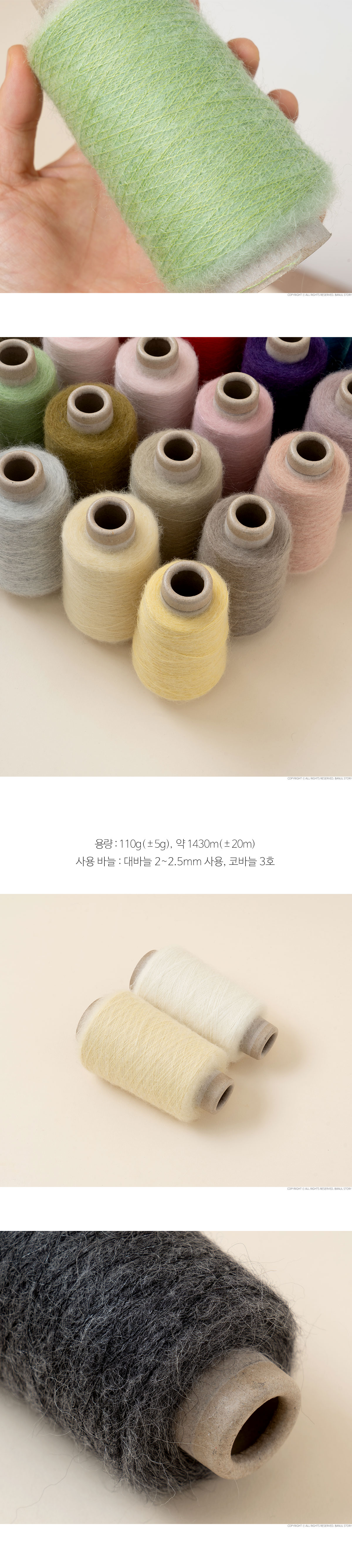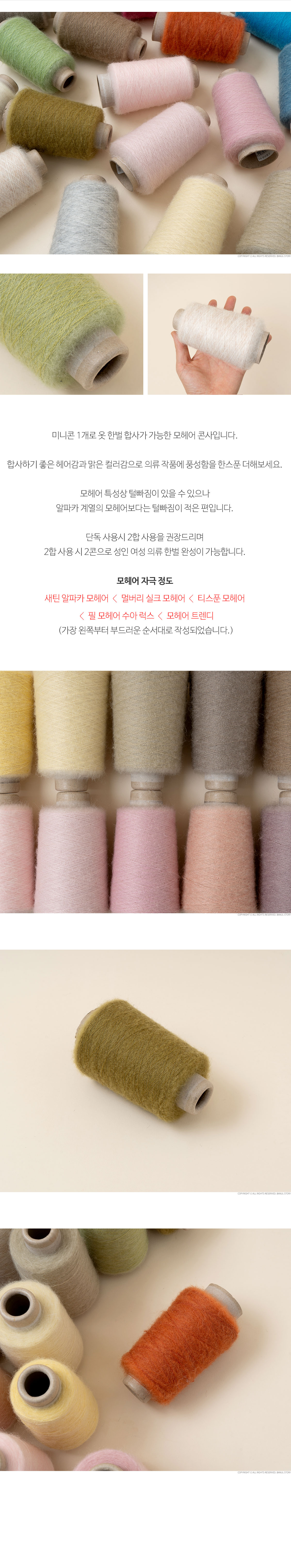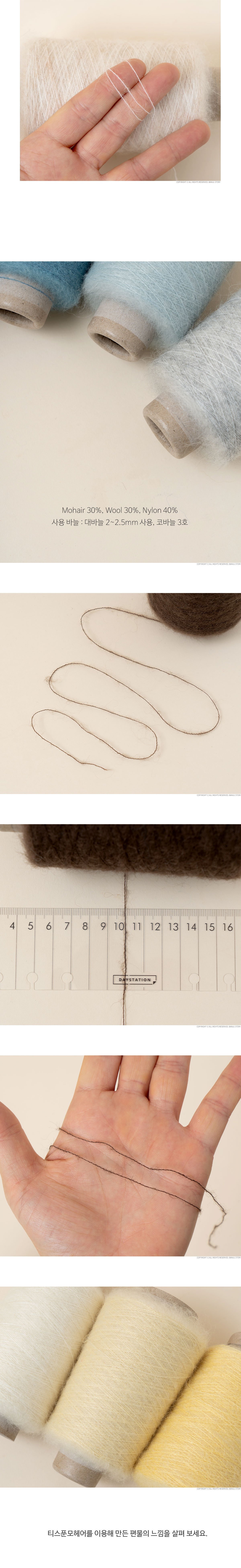 + 중량: 1볼당 110g±5g / 1430m±20m (지관무게 약 26g, 110g+지관 26g 중량으로 발송) + 사용바늘: 대바늘 2mm ~ 2.5mm, 코바늘 3/0호 + 혼용율: Mohair 30%, Wool 30%, Nylon 40% + 제조사: 한국 + 원산지: 중국 + 미니콘 1개로 옷 한벌 합사가 가능한 모헤어 콘사입니다. + 합사하기 좋은 헤어감과 맑은 컬러감으로 의류 작품에 풍성함을 한스푼 더해보세요. + 모헤어 특성상 털빠짐이 있을 수 있으나 알파카 계열의 모헤어보다는 털빠짐이 적은 편입니다. + 단독 사용시 2합 사용을 권장드리며 2합 사용 시 2콘으로 성인 여성 의류 한벌 완성이 가능합니다. + 모헤어 자극 정도 : 새틴 알파카 모헤어 < 멀버리 실크 모헤어 < 티스푼 모헤어 < 필 모헤어 수아 럭스 < 모헤어 트렌디 (가장 왼쪽부터 부드러운 순서대로 작성되었습니다.)
