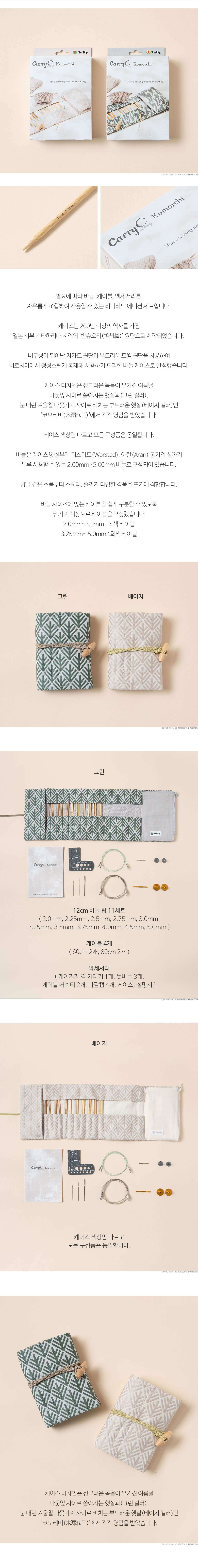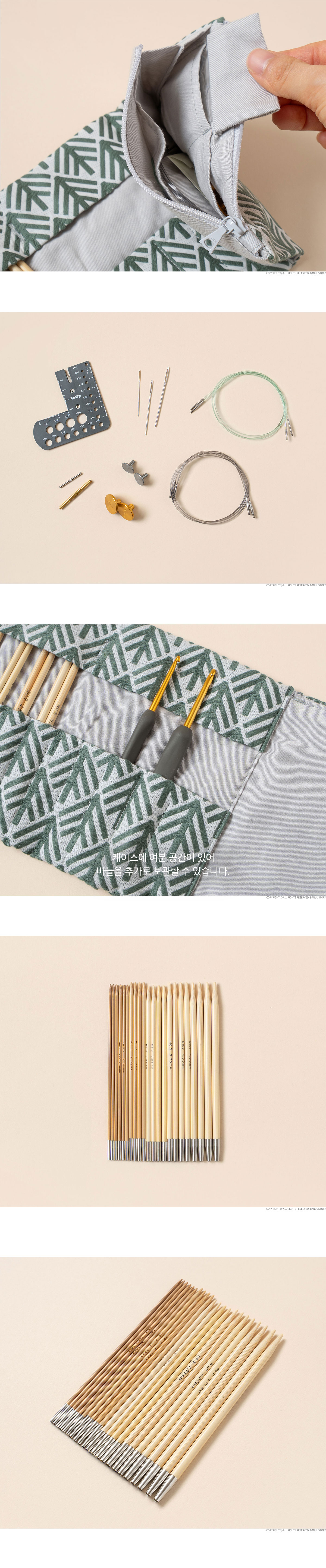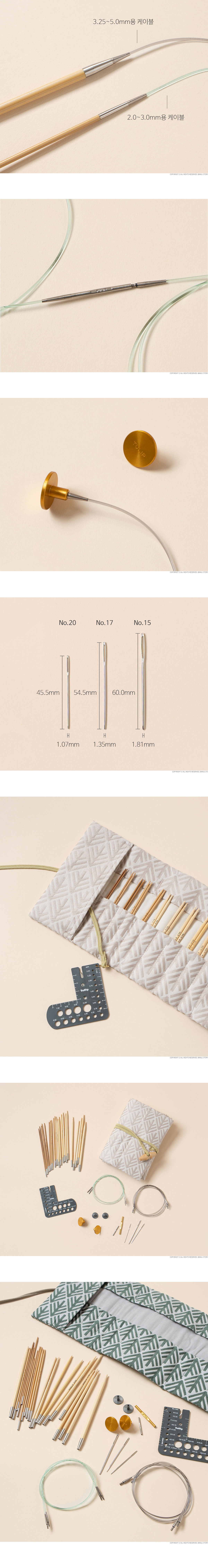 + 세트구성: 바늘 팁 11세트(2.0mm, 2.25mm, 2.5mm, 2.75mm, 3.0mm, 3.25mm, 3.5mm, 3.75mm, 4.0mm, 4.5mm, 5.0mm), 케이블 4개(60cm 2개, 80cm 2개), 악세서리(케이블커넥터 2개, 마감캡 4개, 게이지자 겸 커터기 1개, 돗바늘 3개, 케이스, 설명서) + 바늘길이: 약 12cm(돗바늘 길이- No.20-1.07mm×45.5mm, No.17-1.35mm×54.5mm, No.15-1.81mm×60.0mm) + 재질: 대나무 + 필요에 따라 바늘, 케이블, 액세서리를 자유롭게 조합하여 사용할 수 있는 리미티드 에디션 세트입니다.